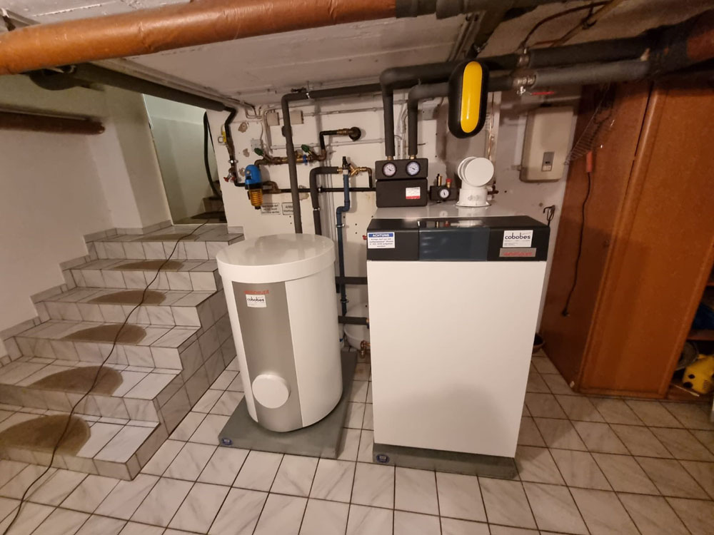 • Einbau einer bodenstehenden Gasbrennwertanlage mit nebengestellten Warmwasserbereiter, Fabrikat: Weishaupt